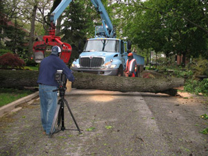 And so it went Mother’s Day, 2008, bras off, bras on, in and out of the yard, up and down the street chatting with neighbors, then nervous vigilance at the living room window as neighborhood kids came to play as they ought. With us shouting from the porch, as we ought, “Be careful there kids! There’s a live wire there!” thinking “Don’t make me put my bra on and come out there!” The hours passed with the dog getting walked as we caught up with neighbors, and yet, as Mother’s Day roasts were coming out of the oven, the street was still blocked and the wire still down when a neighbor suggested another call — this time to the Electric Company. Now how a rat fink connection gets made between someone at the electric company and the media I can’t imagine but it happened and the media did descend — bringing the neighbors back outdoors, our bras back on and my first close encounter with the Media.